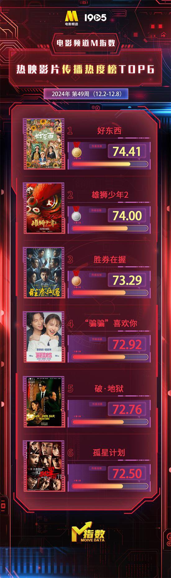 1905电影网讯“电影频道M指数”2024年第49周结果新鲜发布。12月2日-12月8日,“电影频道M指数”热映影片传播热度榜前6位依次为: