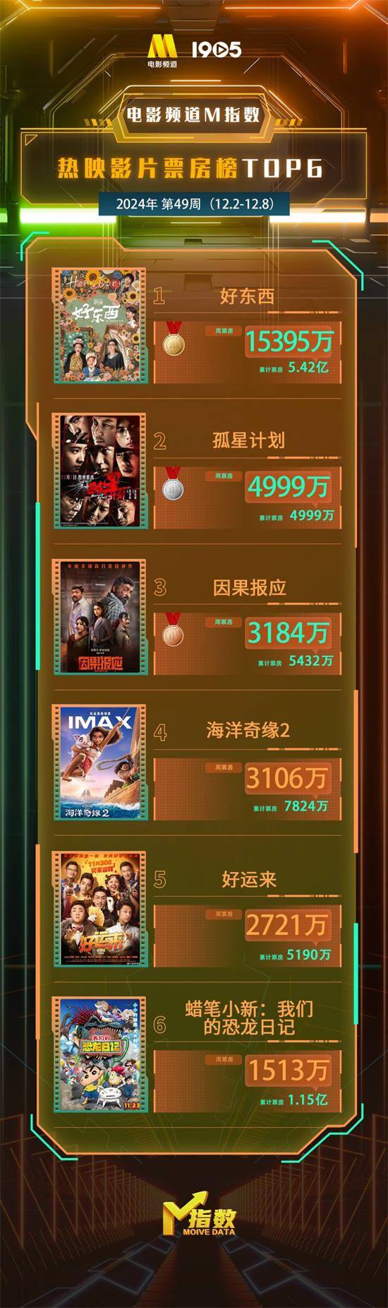 1905电影网讯 “电影频道M指数”2024年第49周结果新鲜发布。12月2日-12月8日,“电影频道M指数”热映影片票房榜前6位依次为: