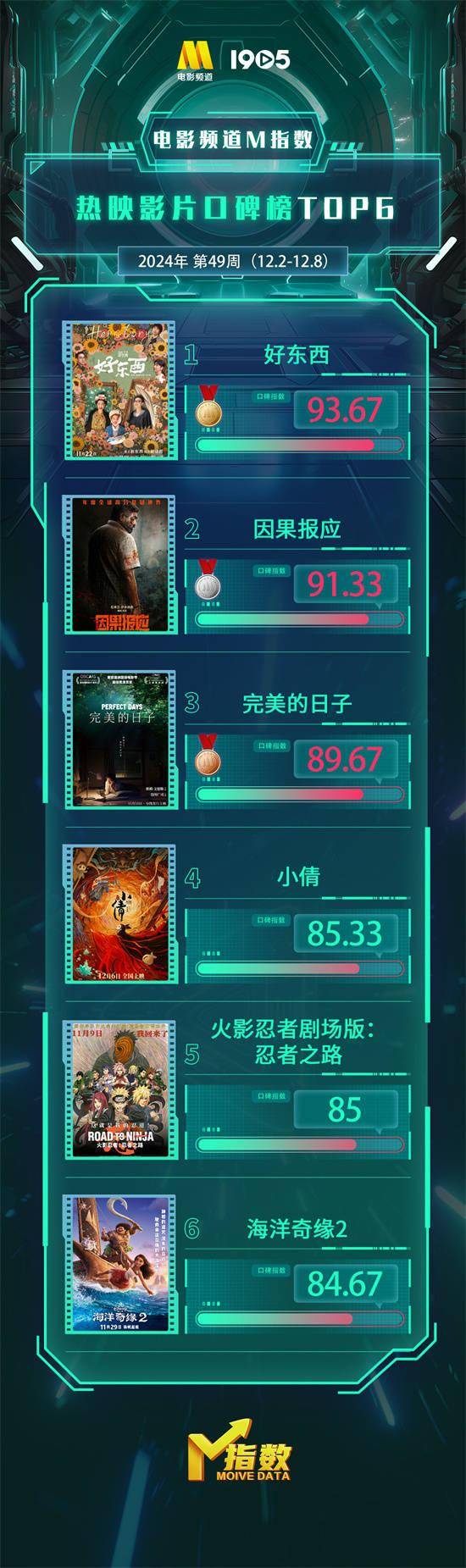 1905电影网讯 “电影频道M指数”2024年第49周结果新鲜发布。12月2日-12月8日,“电影频道M指数”热映影片口碑榜前6位依次为: