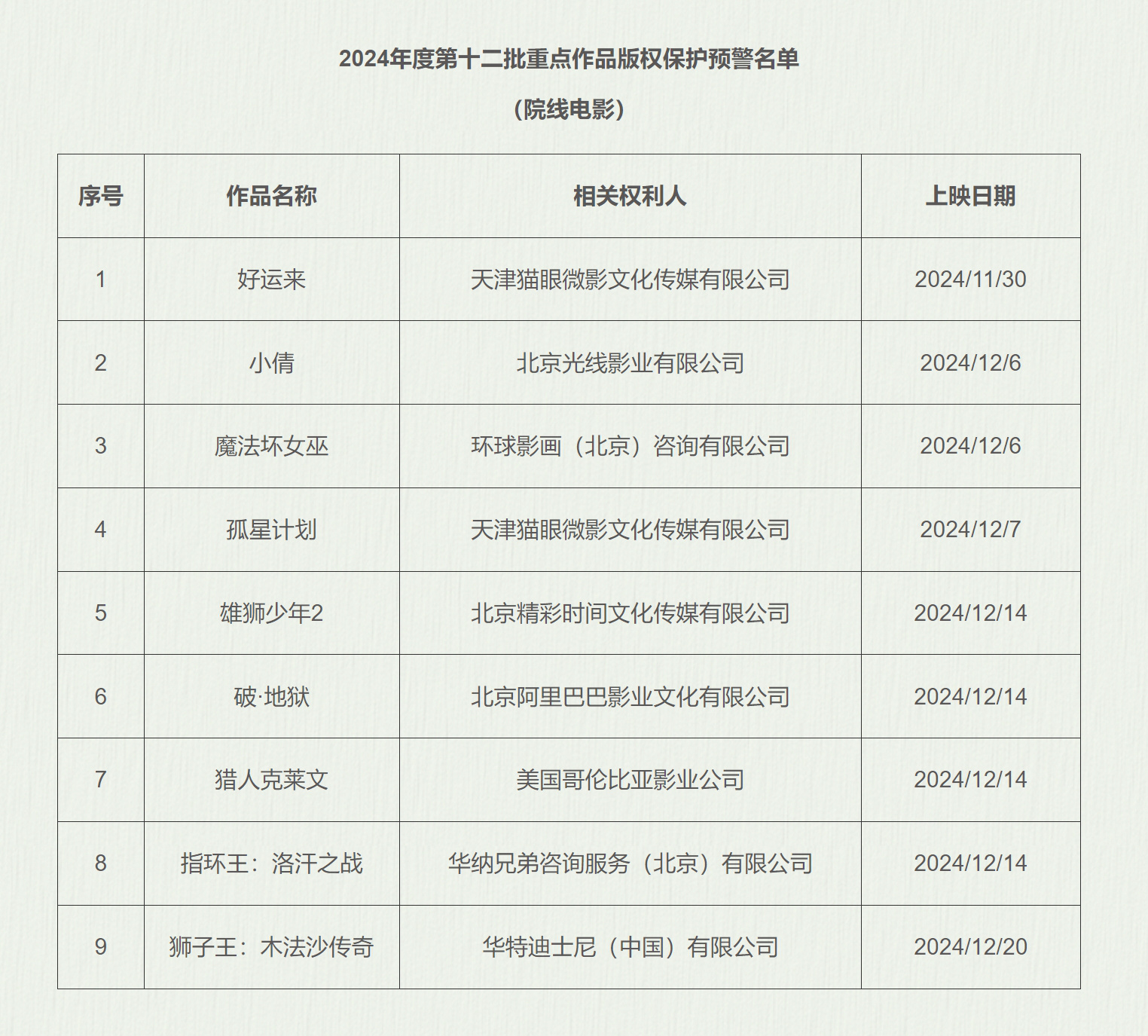 12月12日,国家版权局公布2024年度第十二批重点作品版权保护预警名单(院线电影)。