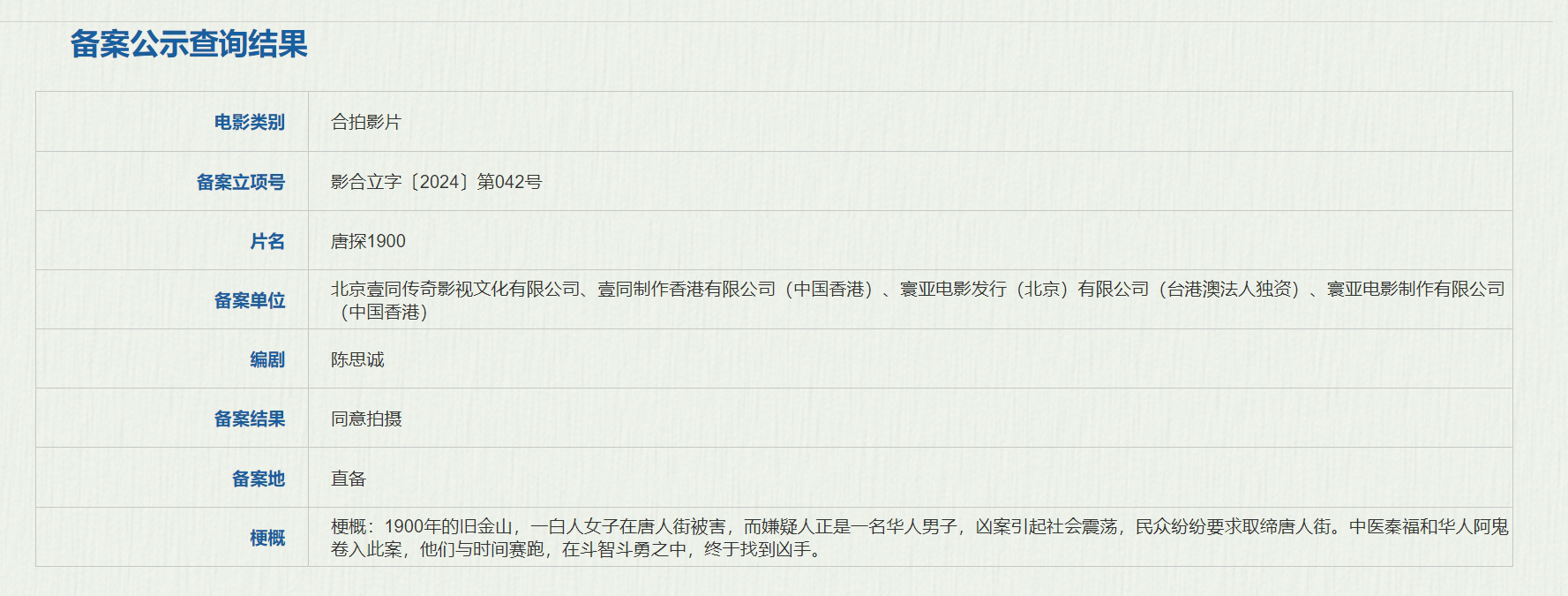 12月13日,国家电影局发布关于2024年11月上全国电影剧本(梗概)备案、立项公示的通知,由陈思诚担任编剧的电影《唐探1900》正式立项。