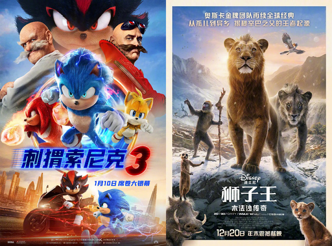《狮子王:木法沙传奇》在全球多票仓同步上映,首周末海外票房达8720万美元,其中包括最大海外票仓中国内地3天780万美元,影片全球总票房达1.22亿美元。《刺猬索尼克3》全球上映相对较晚,自圣诞节后才会多地公映,中国内地已定档2025年1月10日上映。
