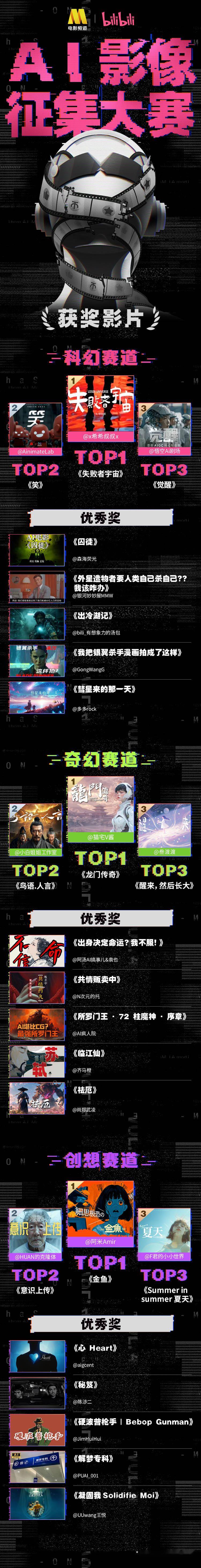 自大赛启动以来,共收到4000余条参赛稿件,超过2500名创作者参与,其中专业参赛的优秀作品有600多条。到活动截止,542条稿件播放量破万,5条稿件播放量破十万,来自影视、AI等各行业的作者们带来了叙事剧情、美学艺术、科幻技术等多元化作品。恭喜以上作品获奖!