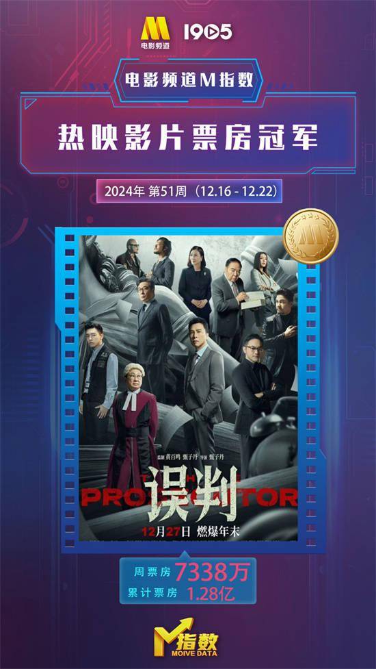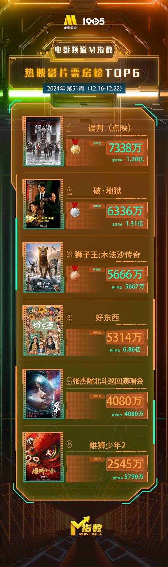 1905电影网讯 “电影频道M指数”2024年第51周结果新鲜发布。12月16日-12月22日,“电影频道M指数”热映影片票房榜前6位依次为: