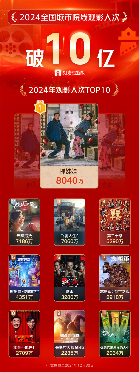 据灯塔专业版,截至12月30日,2024全国城市院线观影人次(含预售)突破10亿。