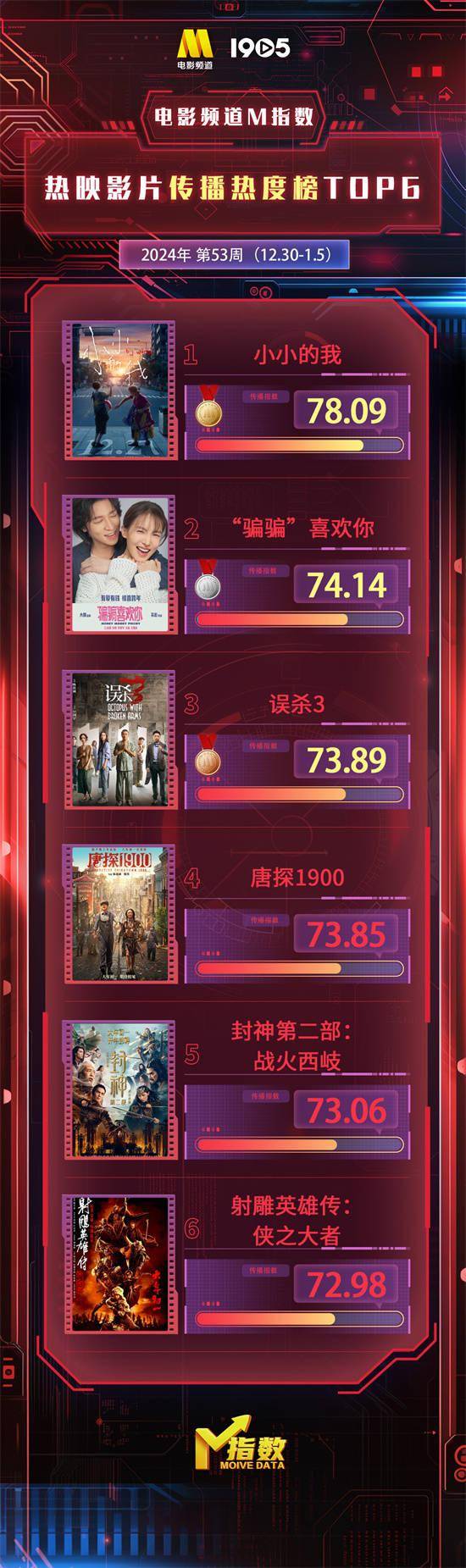 1905电影网讯“电影频道M指数”2024年第53周结果发布。12月30日-1月5日,“电影频道M指数”热映影片传播热度榜前6位依次为: