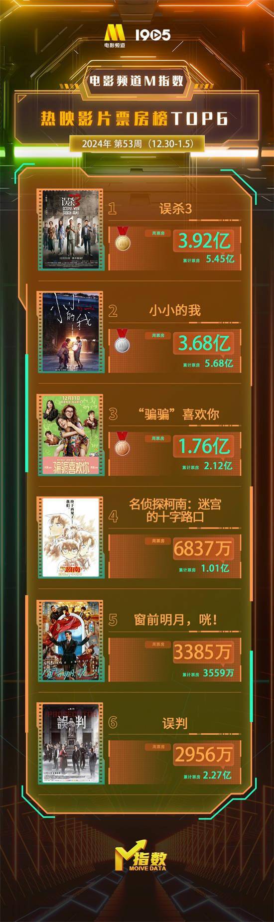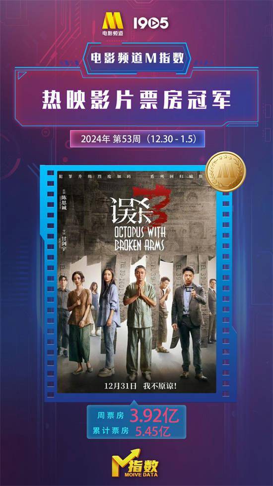 1905电影网讯 “电影频道M指数”2024年第53周结果发布。12月30日-1月5日,“电影频道M指数”热映影片票房榜前6位依次为:
