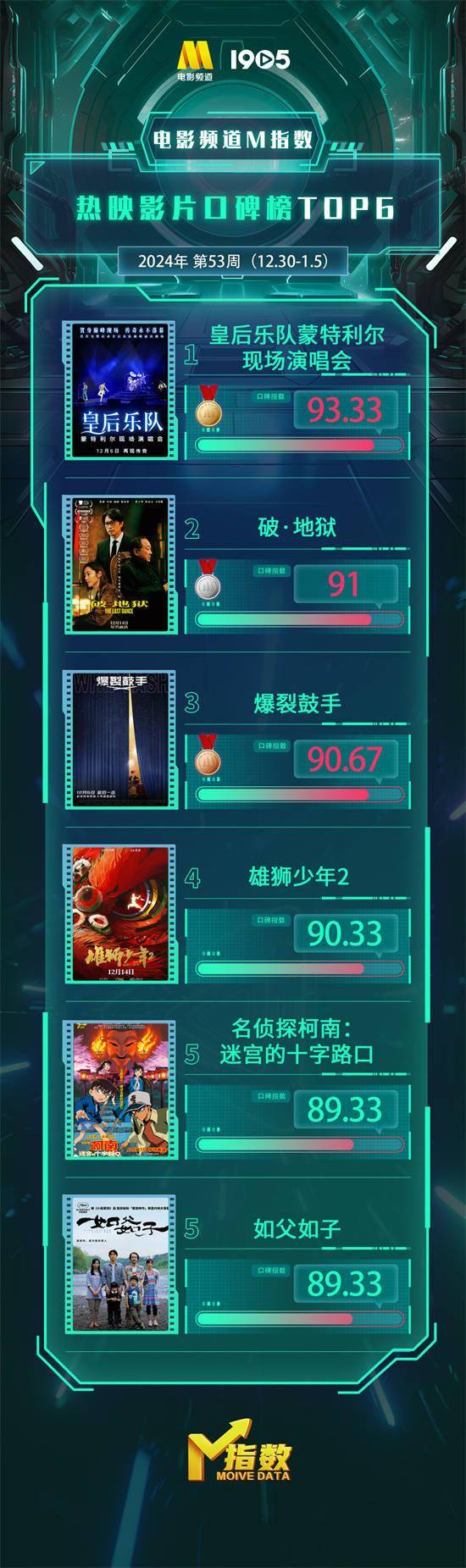 1905电影网讯“电影频道M指数”2024年第53周结果发布。12月30日-1月5日,“电影频道M指数”热映影片口碑榜前6位依次为: