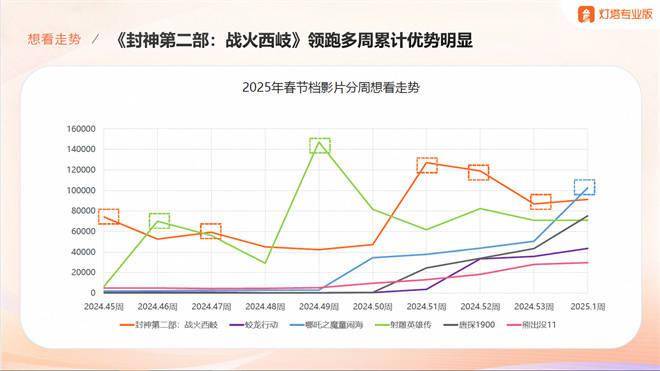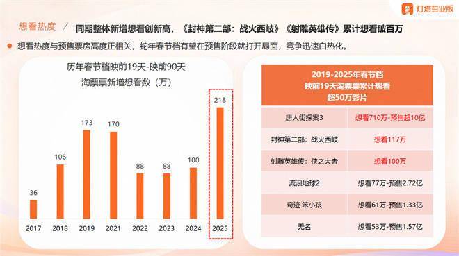 根据灯塔专业版实时宣发数据,2025年春节档影片映前90天至映前17天新增想看超218万,创历史同期新增想看新高,《封神第二部:战火西岐》《射雕英雄传:侠之大者》《哪吒之魔童闹海》位列映前想看TOP3,《封神第二部:战火西岐》和《射雕英雄传:侠之大者》累计想看人数更是率先突破百万。合家欢属性强、受众稳定的“熊出没”在历年春节档票房节节攀升,今年依旧有望继续担任检验头部影片成色的“梯队判官”。