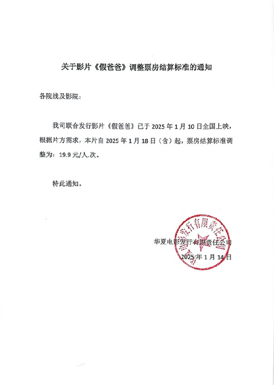 电影《假爸爸》正在热映中。近日,片方发布调整票房结算标准通知,宣布将于1月18日(含)起,票房结算标准调整为19.9元/人.次。据悉,这是2025年度以来,继《“骗骗”喜欢你》《火锅艺术家》后第三部宣布调整票房结算标准的电影。截至目前,影片已收获2445.5万元票房。