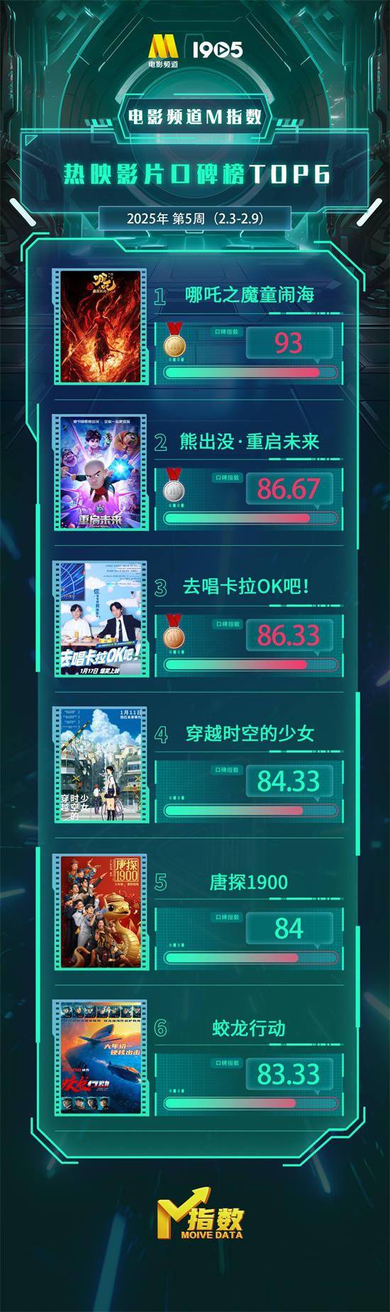 1905电影网讯 “电影频道M指数”2025年第5周结果发布。2月3日-2月9日,“电影频道M指数”热映影片口碑榜前6位依次为: