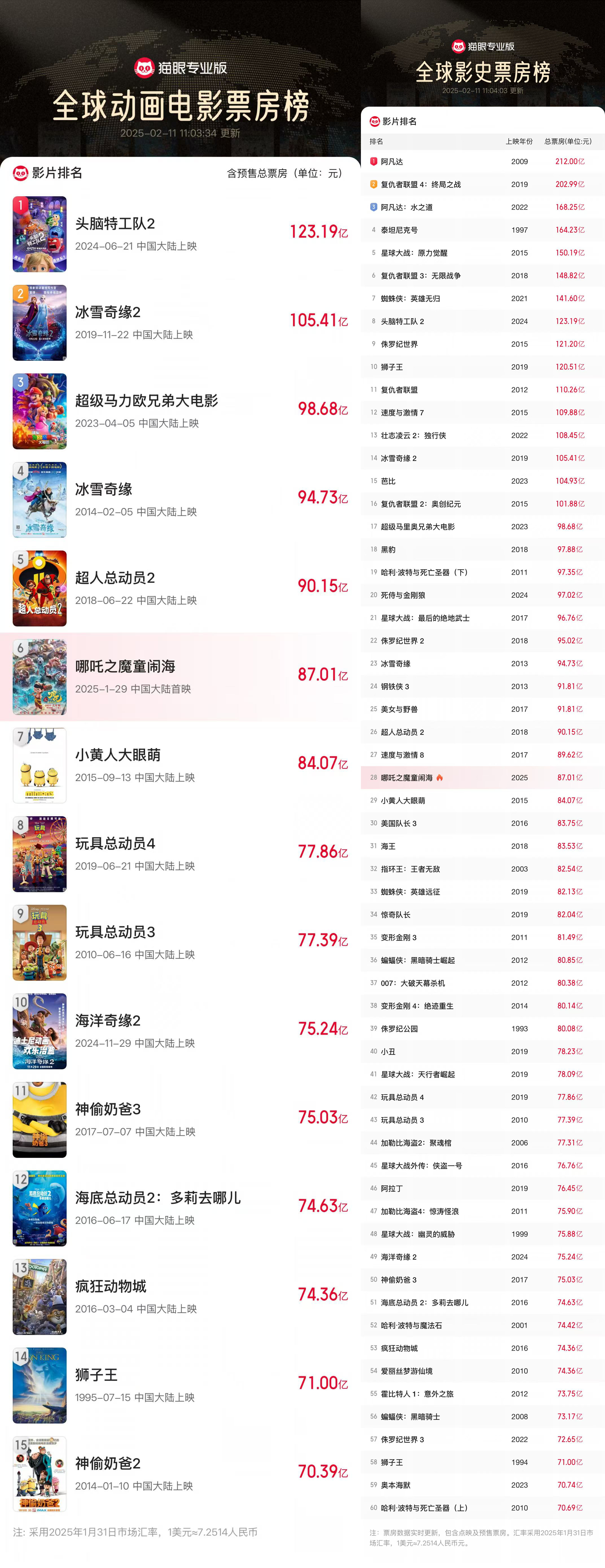 据网络平台数据,截至2月11日,电影《哪吒之魔童闹海》(下文简称《哪吒2》)上映14天,累计总票房(含预售)已超87.07亿元,超过《小黄人大眼萌》84.07亿元的成绩,跻身全球影史票房榜第28位!同时,《哪吒2》在全球动画电影票房榜成绩也越冲越勇,目前已升至榜单前六,下一个目标是排在第五位的《超人总动员2》(90.15亿元)。