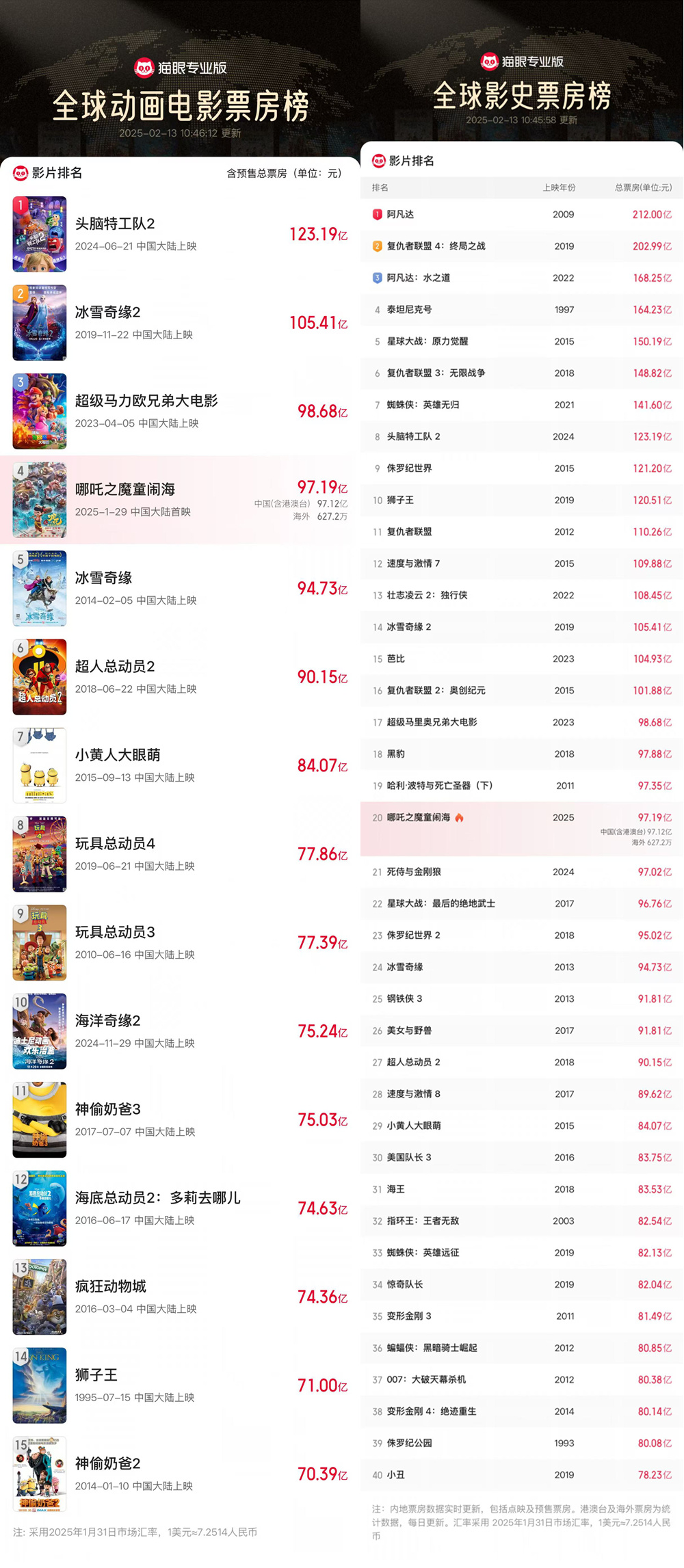 截至2月13日10时30分,电影《哪吒之魔童闹海》(下文简称《哪吒2》)上映16天,累计总票房(含预售)突破97亿元,其中包含海外票仓627.2万元。同时,《哪吒2》的全球影史票房排名升至前20,突破2024年全球电影票房榜第二名《死侍与金刚狼》97.02亿的纪录,全球动画电影票房榜也升至第四位!