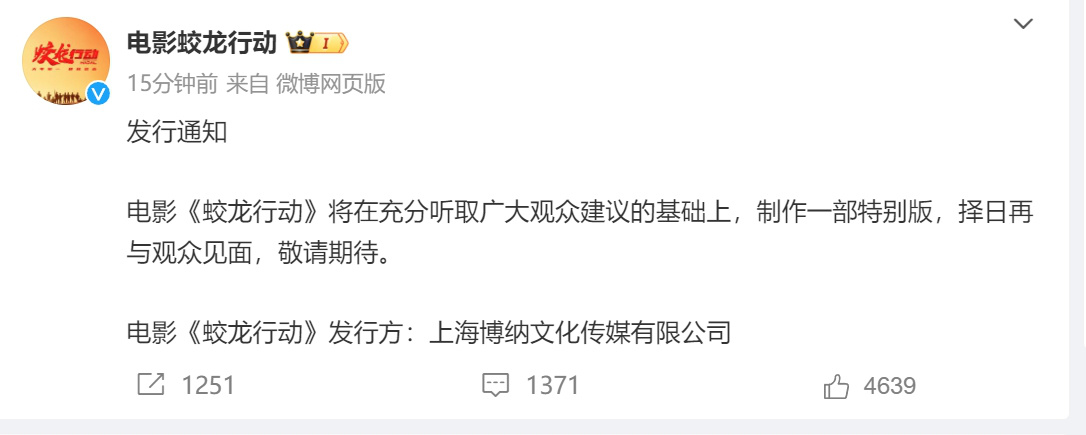 2月14日,电影《蛟龙行动》宣布将制作特别版择日再与观众见面,片方表示:“将在充分听取广大观众建议的基础上,制作一部特别版,择日再与观众见面,敬请期待。”