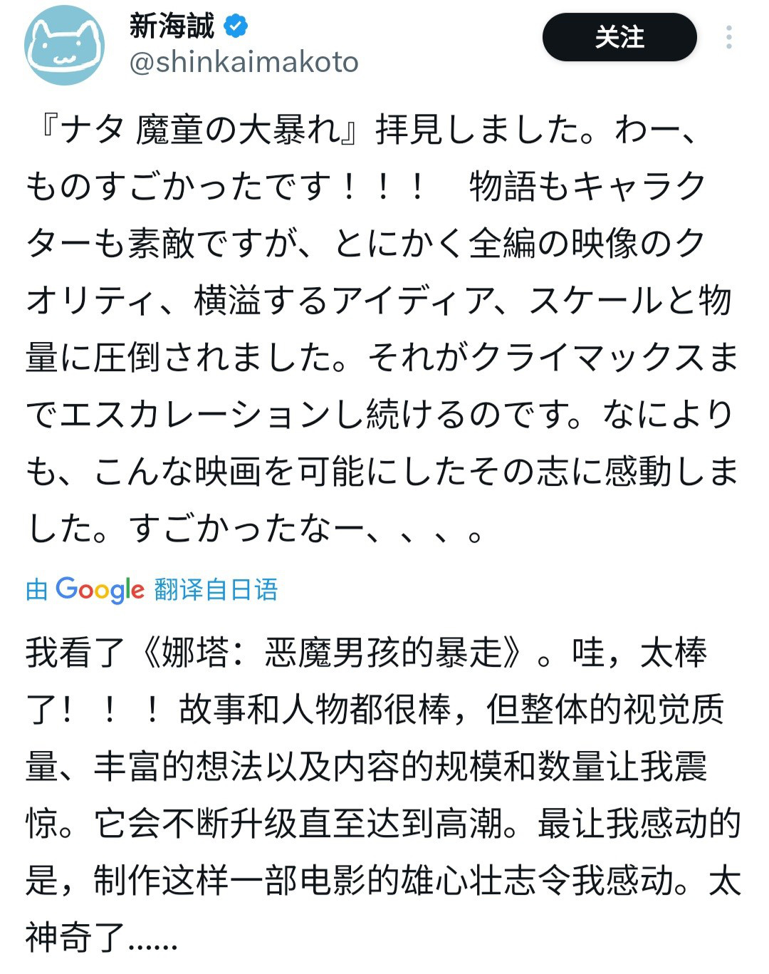 近日,日本知名导演新海诚在社交媒体上分享了观看《哪吒之魔童闹海》(日文译名:ナタ魔童の大暴れ)的观影感受,并热情赞扬了影片。新海诚称,电影的影像质量、创意、规模以及体量都让他感到震撼,制作出这样一部电影的雄心壮志也让他十分感动。