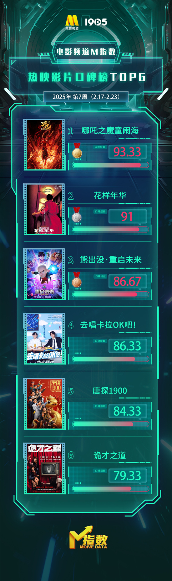 “电影频道M指数”2025年第7周结果发布。2月17日-2月23日,“电影频道M指数”热映影片口碑榜前6位依次为: