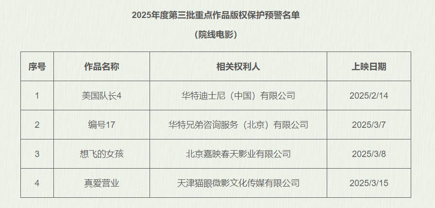 2月26日,国家版权局公布2025年度第三批重点作品版权保护预警名单(院线电影)。
