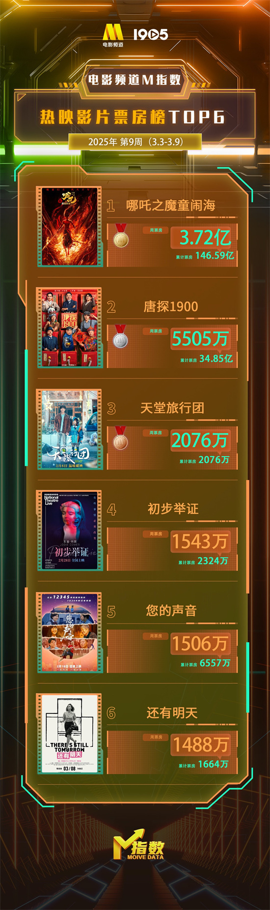 “电影频道M指数”2025年第9周结果发布。3月3日-3月9日,“电影频道M指数”热映影片票房榜前6位依次为: