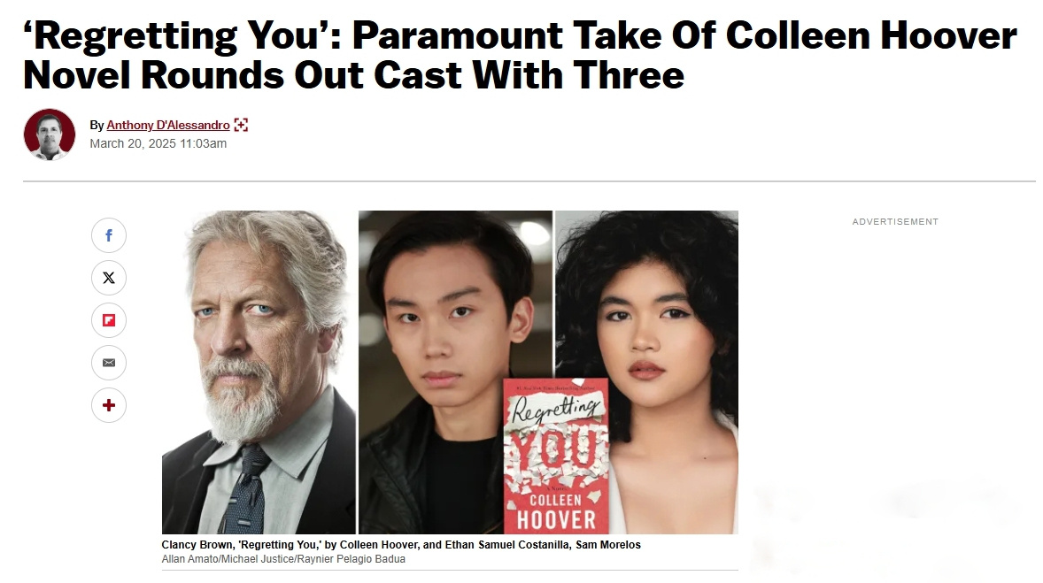 据外媒报道,派拉蒙影业改编自科琳·胡佛2019年畅销小说《为你遗憾》(Regretting You)的电影追加卡司,包括克兰西·布朗、山姆·莫雷洛斯和伊桑·塞缪尔·康斯坦尼拉,他们将与斯科特·伊斯特伍德、艾莉森·威廉姆斯、戴夫·弗兰科、麦肯娜·格瑞丝、梅森·泰晤士等共同出演。
