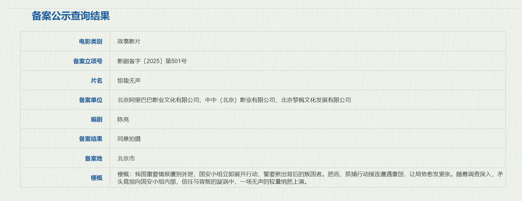 3月27日,国家电影局发布关于2025年2月下全国电影剧本(梗概)备案、立项公示的通知。电影《惊蛰无声》正式立项,由陈亮担任编剧。