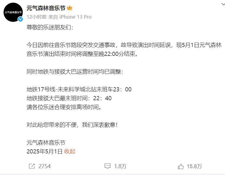 5月1日晚,@元气森林音乐节 发布致歉声明,称“今日因前往音乐节路段突发交通事故,故导致演出时间延误,现5月1日元气森林音乐节演出结束时间将调整至晚22:00分结束。同时地铁与接驳大巴运营时间均已调整。”