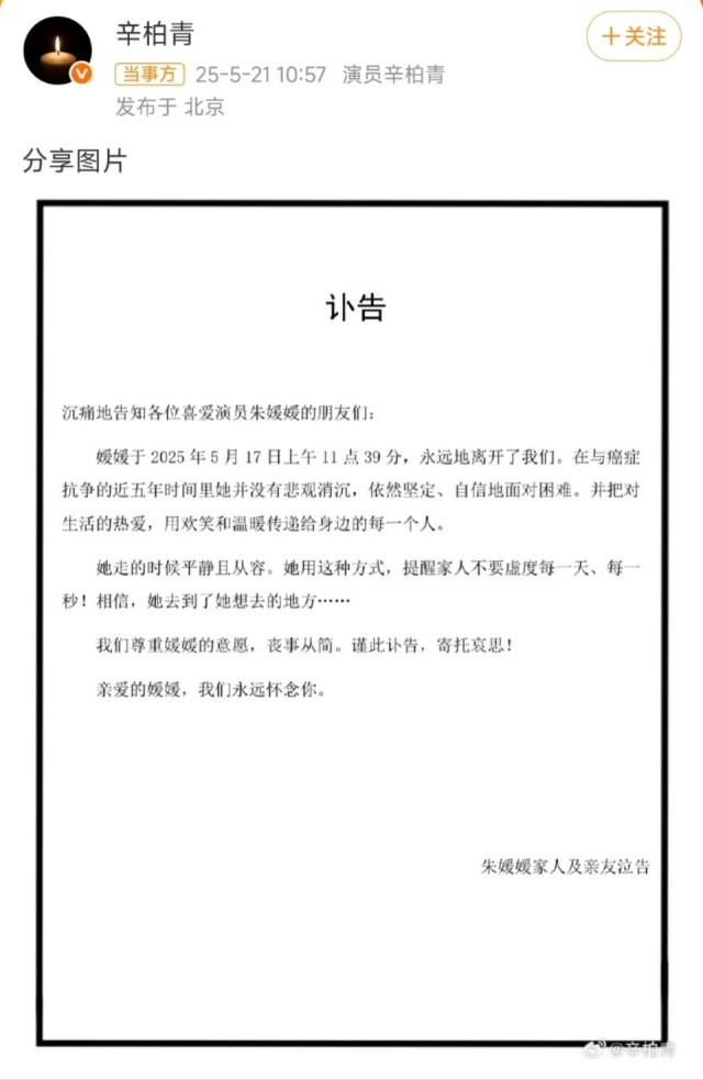 5月21日,演员辛柏青发布讣告,其妻子、演员朱媛媛于2025年5月17日上午11点39分去世。讣告中写到:“在与癌症抗争的近五年时间里她并没有悲观消沉,依然坚定、自信地面对困难。并把对生活的热爱,用欢笑和温暖传递给身边的每一个人。”