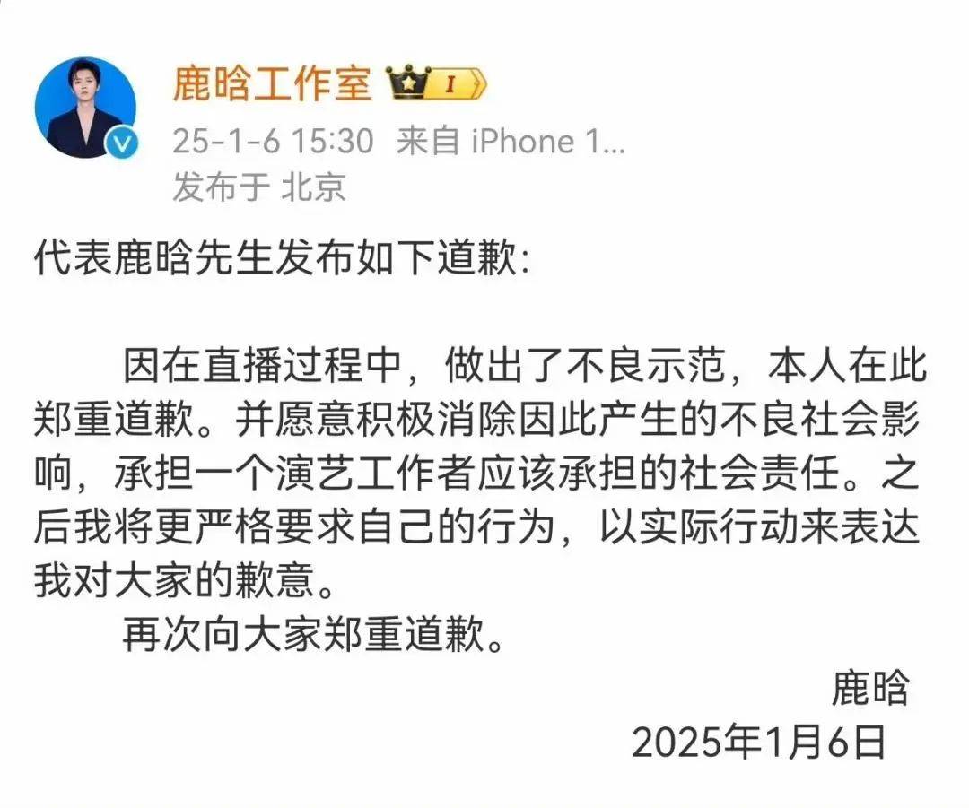 但之后鹿晗工作室就发出了鹿晗的道歉文。