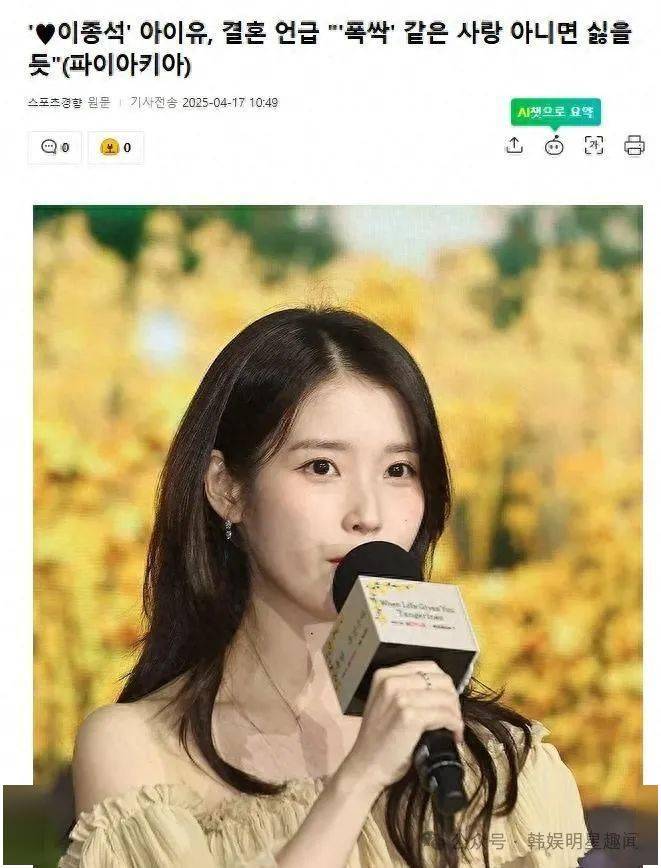 大家好呀这里是你们的小娱!今天要和大家聊一个超劲爆的话题——国民妹妹IU竟然公开谈结婚观了!据韩国媒体4月17日报道,在最新节目中,IU不仅大谈《苦尽柑来遇见你》观后感,还首次透露了自己的婚姻态度,这波真心话简直太有料了!快跟小娱一起来看看吧。