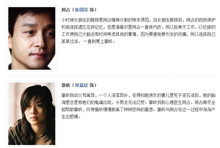 据悉,惊悚电影《异度空间》是张国荣的遗作,该影片于2002年3月28日在中国香港上映,主要讲述了章昕(林嘉欣 饰)因经常看到灵异幻象,求助心理医师阿占(张国荣 饰),在这一过程中两人之间产生了爱情,但是一直不信有鬼的阿占最终也遇到了鬼的故事。