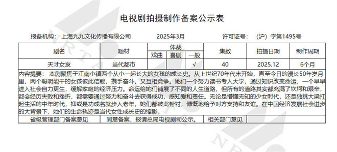 4月15日,广电总局办公厅发布关于2025年3月全国拍摄制作电视剧备案公示的通知。根据备案公示信息,剧集《天才女友》将于12月开拍,共40集。剧集《天才女友》剧情或改编自埃莱娜·费兰特的畅销著作《那不勒斯四部曲》,这部作品也被改编为HBO旗下的知名剧集《我的天才女友》,该剧共四季,已正式完结。