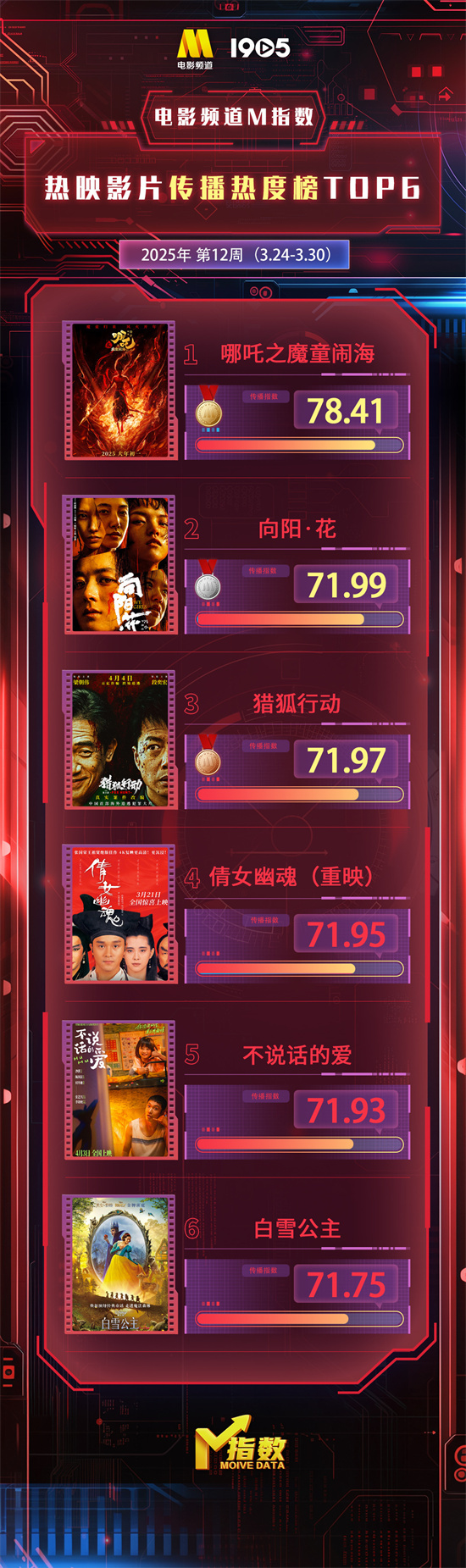 “电影频道M指数”2025年第12周结果发布。3月24日-3月30日,“电影频道M指数”热映影片传播热度榜前6位依次为: