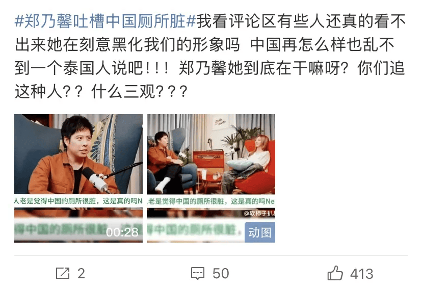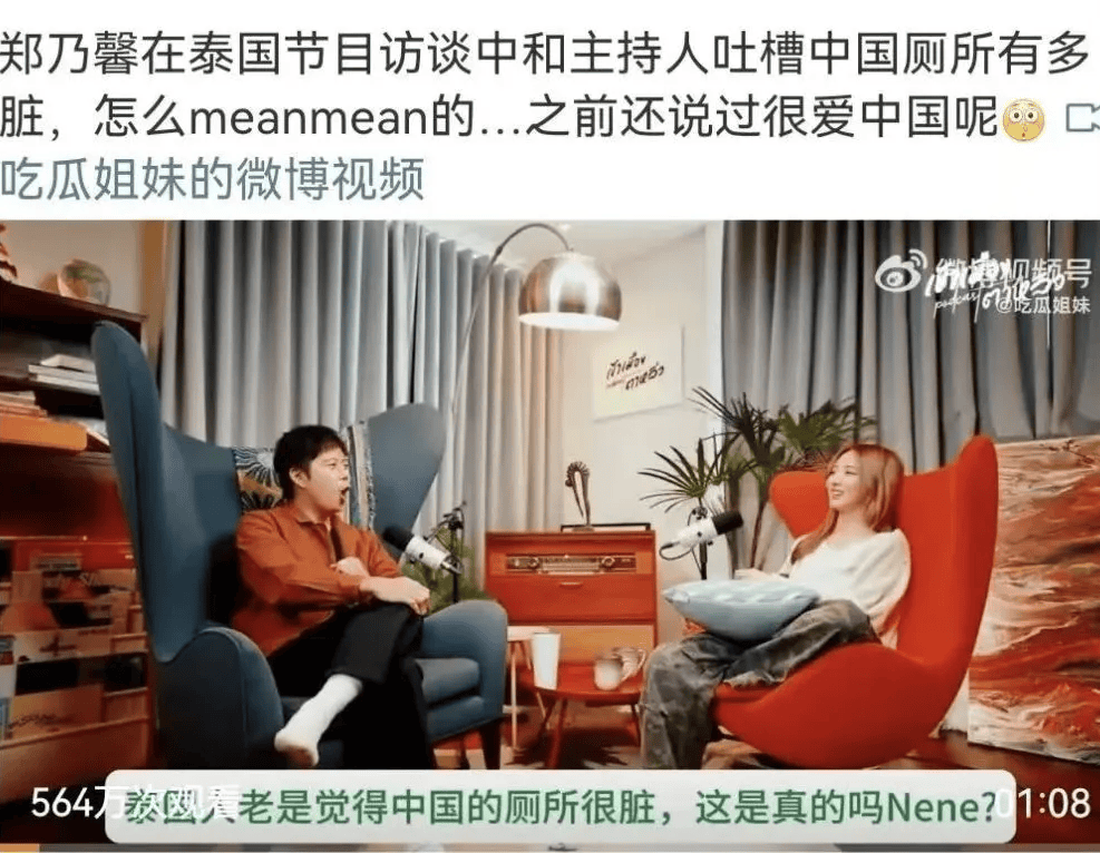 想不到啊想不到,红了的郑乃馨刚回泰国就飘了,上节目连装都不装了,直接吐槽中国人的厕所太脏。