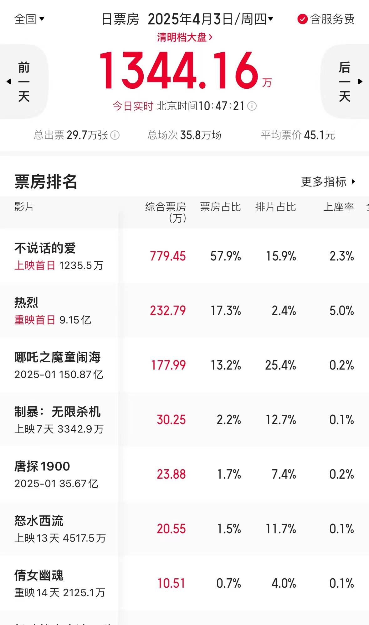 《不说话的爱》今日(4月3日)首日上映,打破《哪吒之魔童闹海》持续2个多月的单日票房冠军。