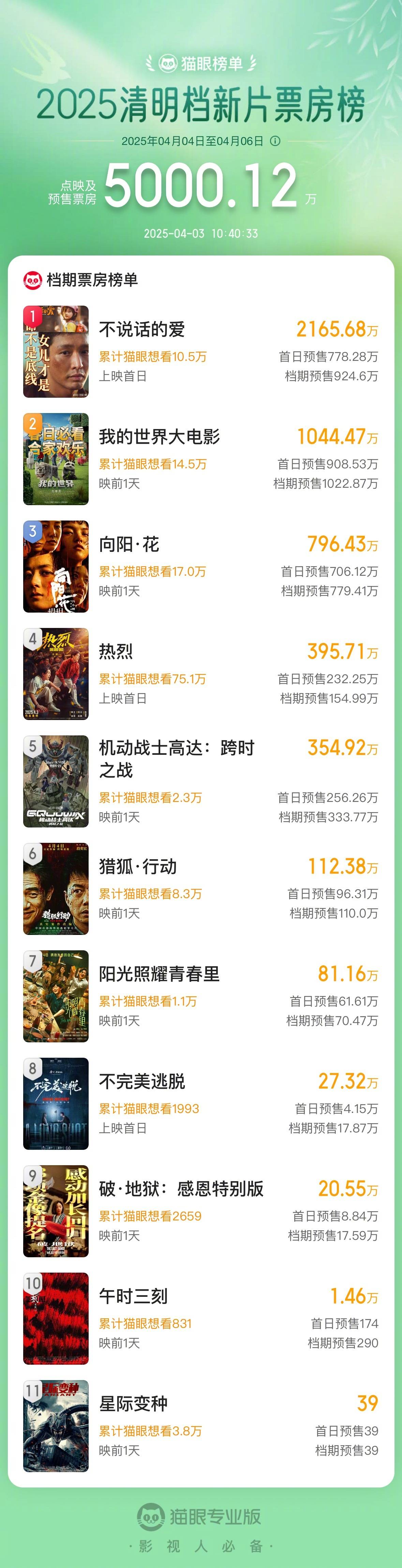 搜狐娱乐讯 据猫眼专业版数据,截至4月3日10:40,2025年清明档上映影片票房(含点映及预售)突破5000万。张艺兴 领衔主演聋人题材亲情电影《不说话的爱》累计超2000万领跑。