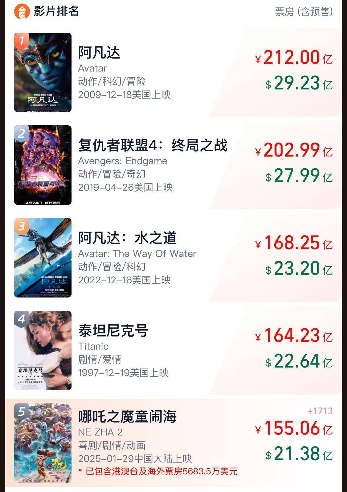 此外,《哪吒2》出海票房超4894.2万美元,冲进国产电影出海榜前十!截至当前全球累计票房已达155亿元,暂列全球影史票房榜前5。