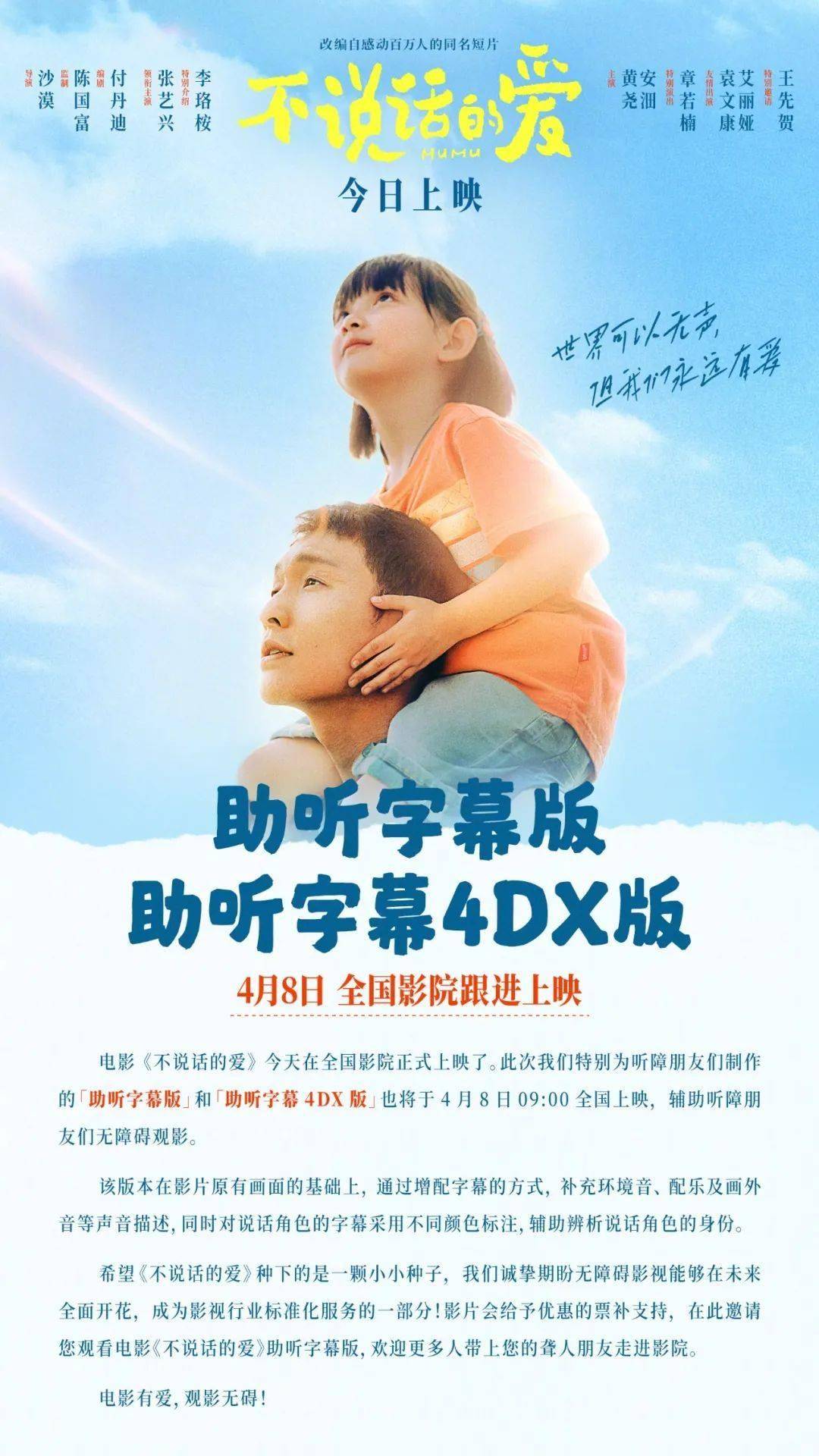 电影《不说话的爱》为听障朋友特别制作「助听字幕版」,并将于4月8日上映此版本。该版本通过增配详细字幕的形式,帮助听障朋友更全面有效地获取信息、理解故事。主创希望以这种方式,推动影视行业无障碍观影的标准化进程,为更多观众带来平等、无碍的观影体验。