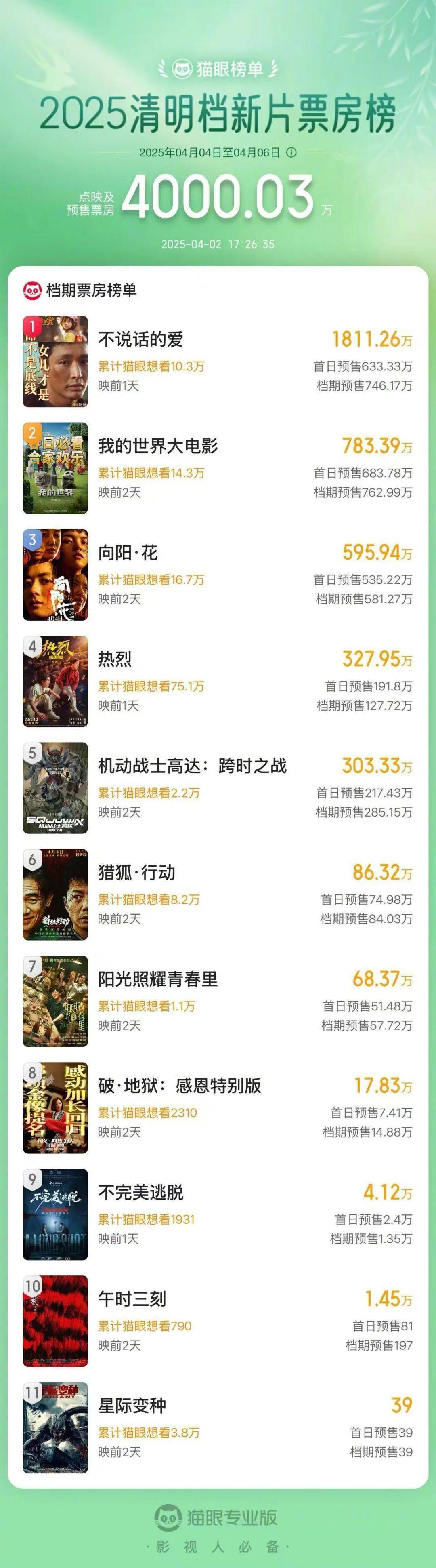 据网络平台数据,截至4月3日9时15分,2025年清明档新片(含重映)票房(含点映及预售)突破5000万。 目前票房前三名为《不说话的爱》《我的世界大电影》《向阳·花》。