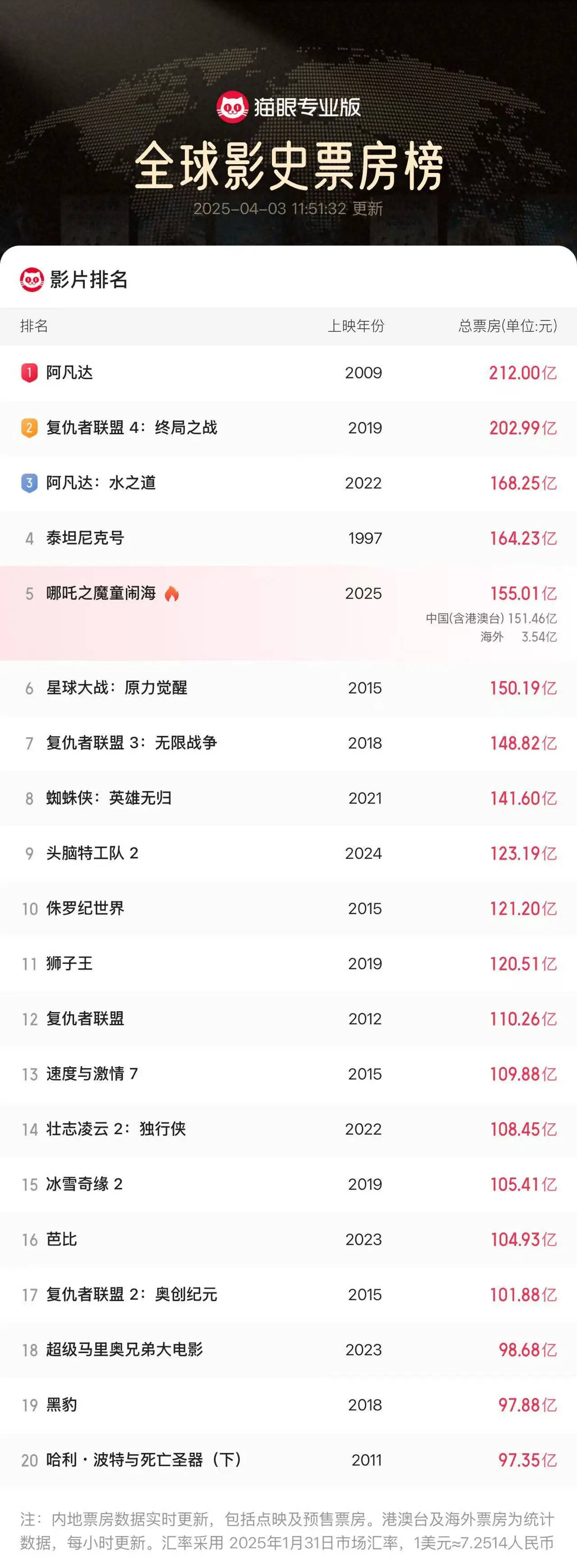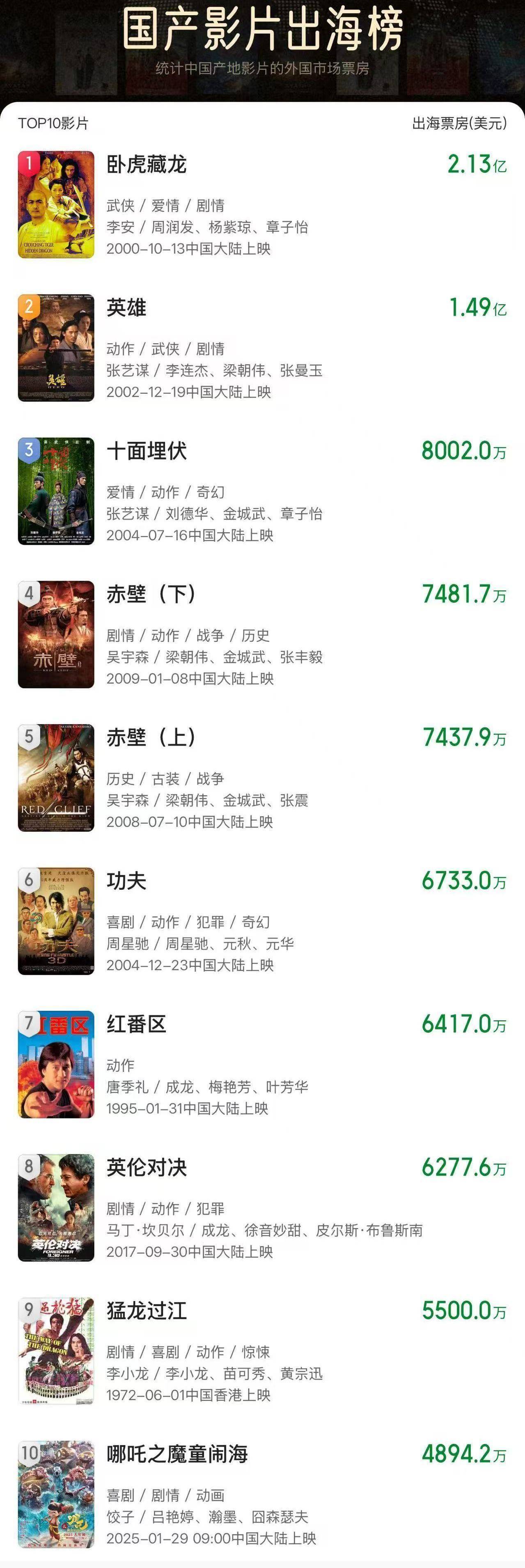 搜狐娱乐讯 3日,据猫眼专业版数据,《哪吒之魔童闹海》出海票房超4894.2万美元,冲进国产电影出海榜前十!此外,《哪吒2》全球累计票房已突破155亿,暂列全球影史票房榜前五!