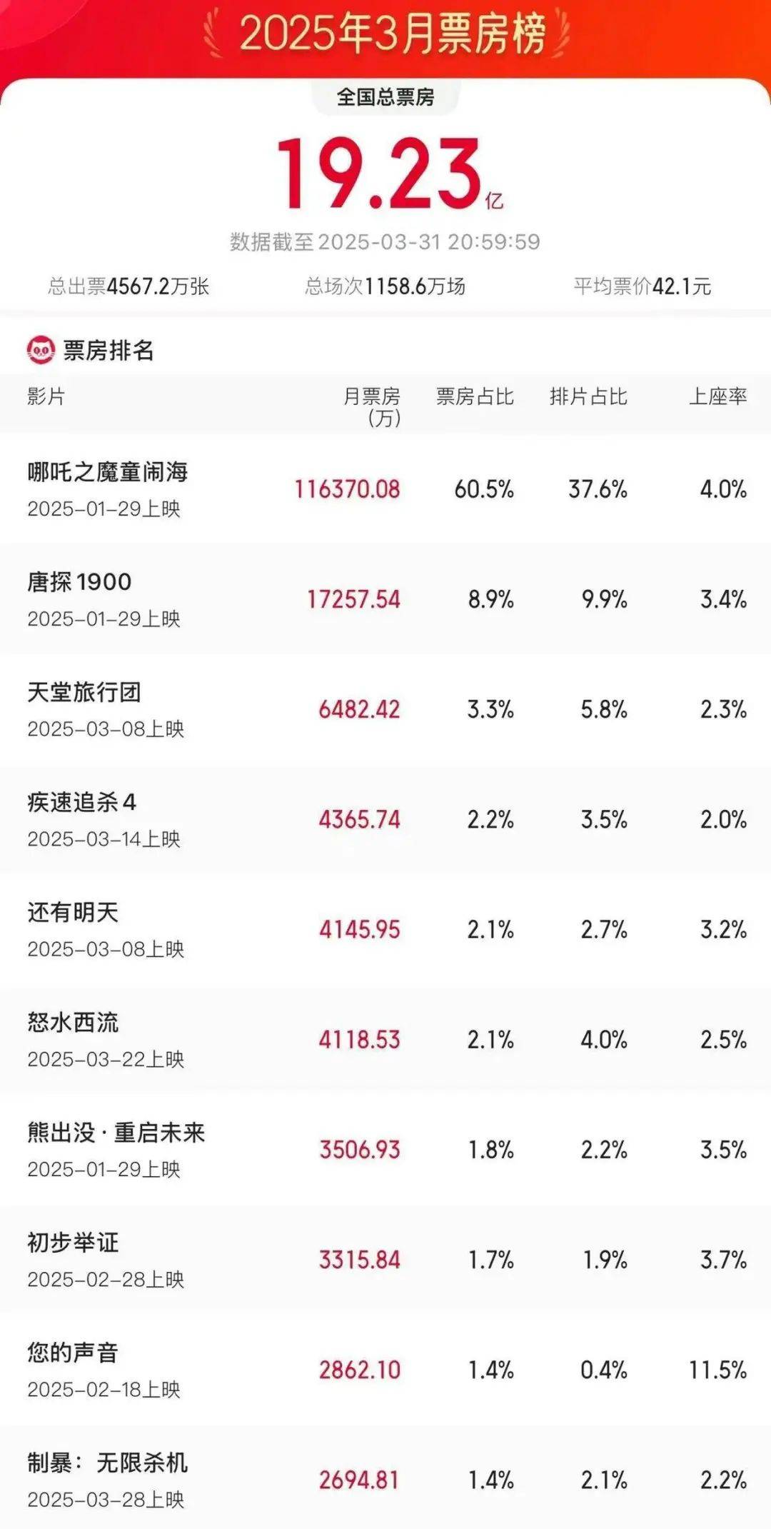 据猫眼专业版统计,2025年3月全国总票房19.23亿,《哪吒之魔童闹海》连续3次成月票房冠军。