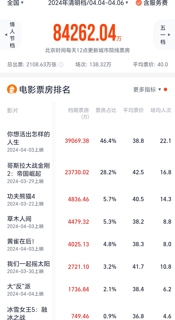 去年清明档,最有竞争力的是宫崎骏的动画电影《你想活出怎样的人生》,清明档三天票房3.91亿元,占了46.4%市场份额。