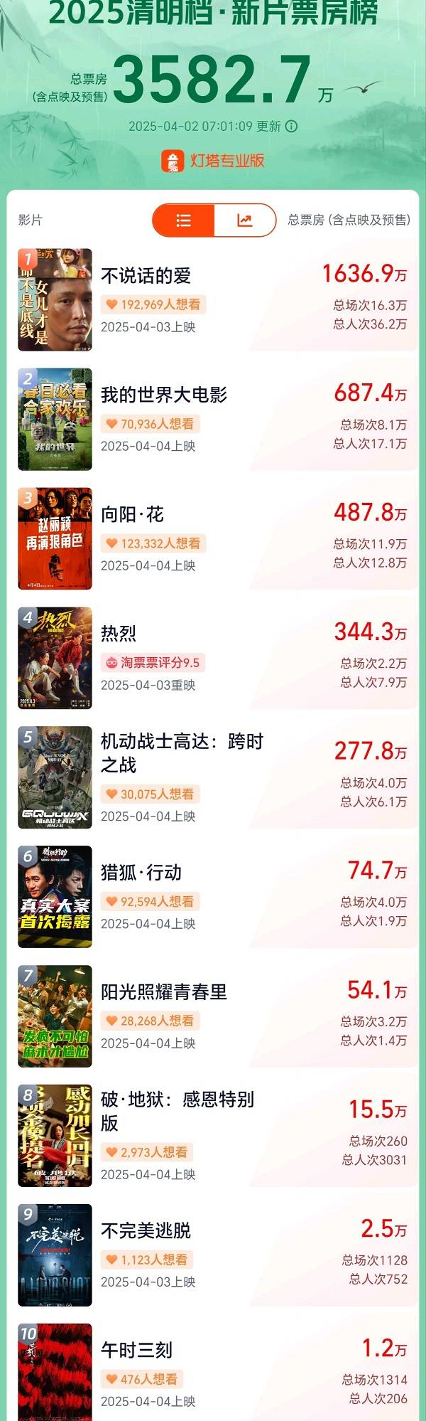 今年清明档的新片从猫眼、淘票票的累计想看人数及映前预售看,能撑市场的主要是张艺兴主演的《不说话的爱》、赵丽颖主演的《向阳·花》,及进口片《我的世界大电影》《机动战士高达:跨时之战》。