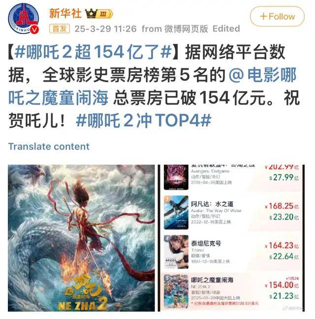 算上前面的《美国队长4》和《白雪公主》,这已经是第三部输给《哪吒2》的好莱坞大片了。与此同时,又因为票房正式突破154亿,又有不少官方媒体发文表示庆贺。还画饼说距离第四名《泰坦尼克号》164亿已有不远的差距。