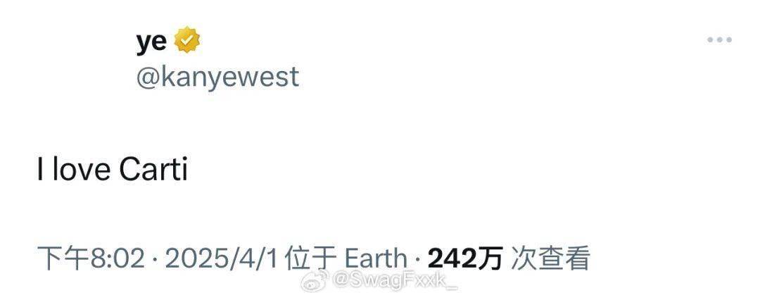 而Ye除了单方面和Drake化敌为友后,Kanye还向PlayBoi Carti表达了love and peace!