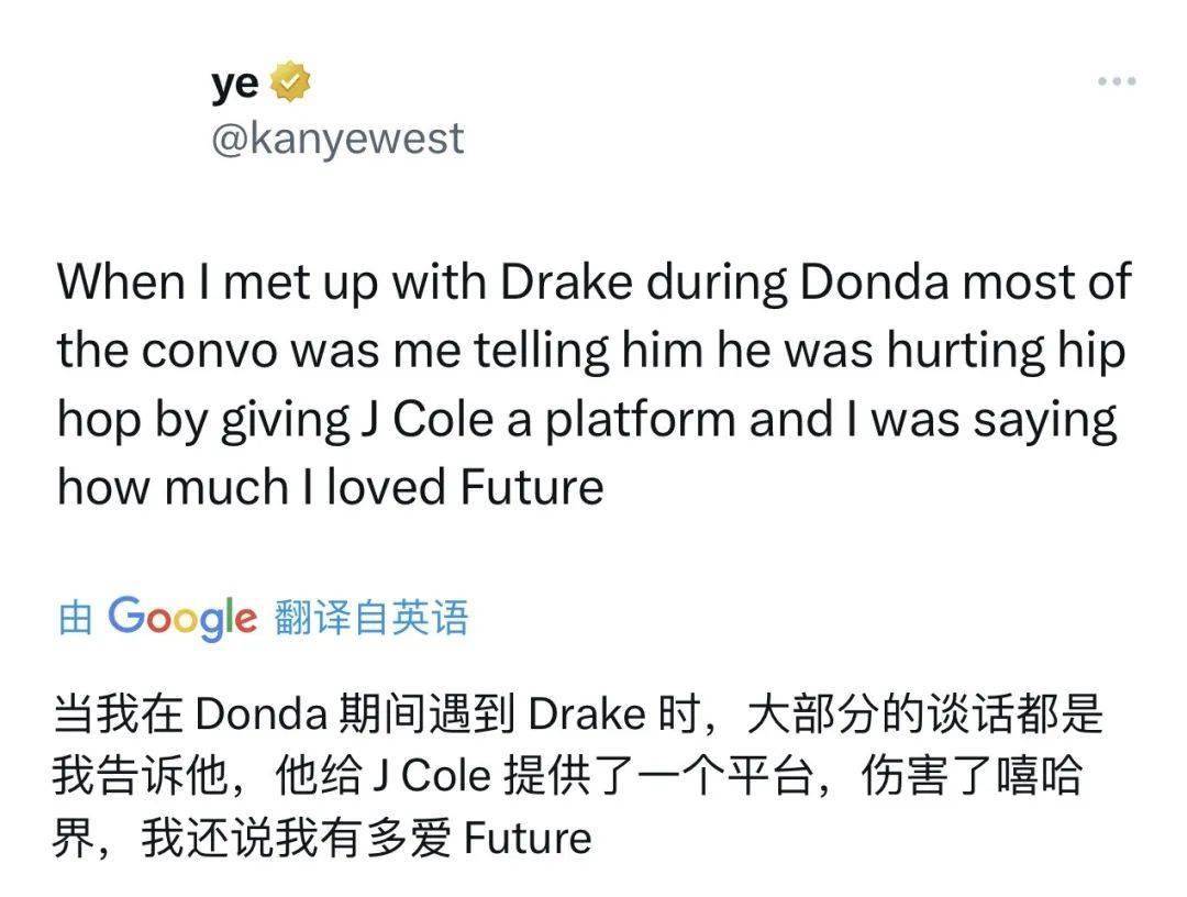 另外,Ye还透露在和Drake聊天时,谈到了Future,但同时Ye也开怼了另一位rapper:J.Cole