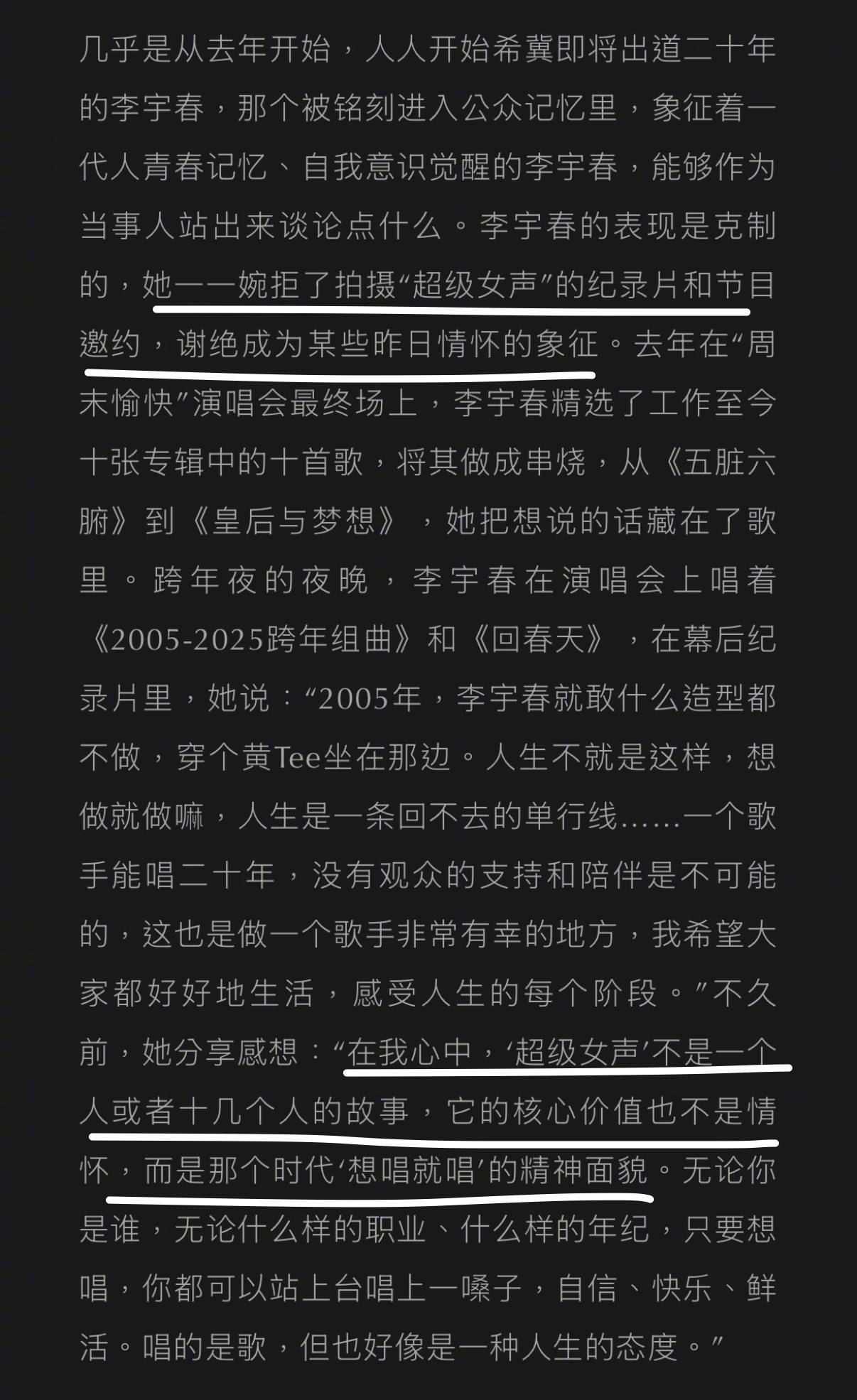 搜狐娱乐讯 近日,李宇春在采访中再谈婉拒拍摄《超级女声》纪录片和节目邀约的原因,称自己“谢绝成为某些昨日情怀的象征”。李宇春说:“在我心中,‘超级女声’不是一个人或者十几个人的故事,它的核心价值也不是情怀,而是那个时代‘想唱就唱’的精神面貌。无论你是谁,无论什么样的职业、什么样的年纪,只要想唱,你都可以站上台唱上一嗓子,自信、快乐、鲜活。唱的是歌,但也好像是一种人生的态度。”