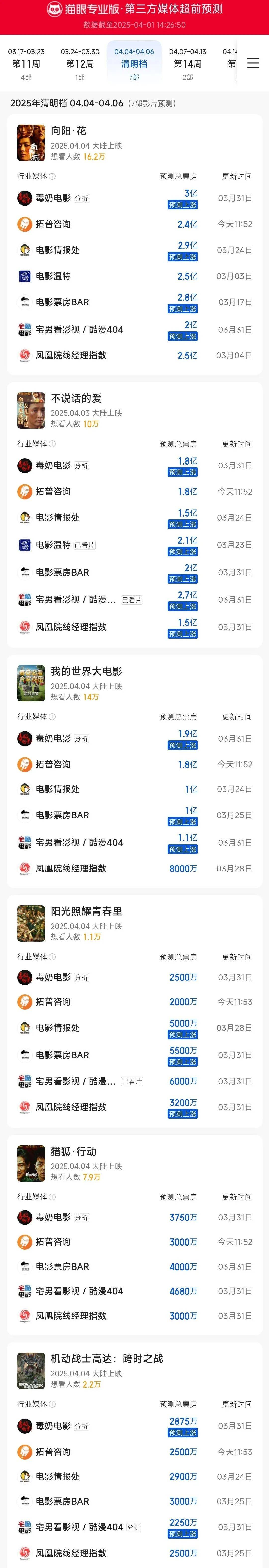 根据猫眼专业版搜集的第三方媒体超前预测,以上新片中最被看好的《向阳·花》预测最终票房也仅为2-3亿量级,此外也仅有《不说话的爱》和《我的世界大电影》被看好过亿。