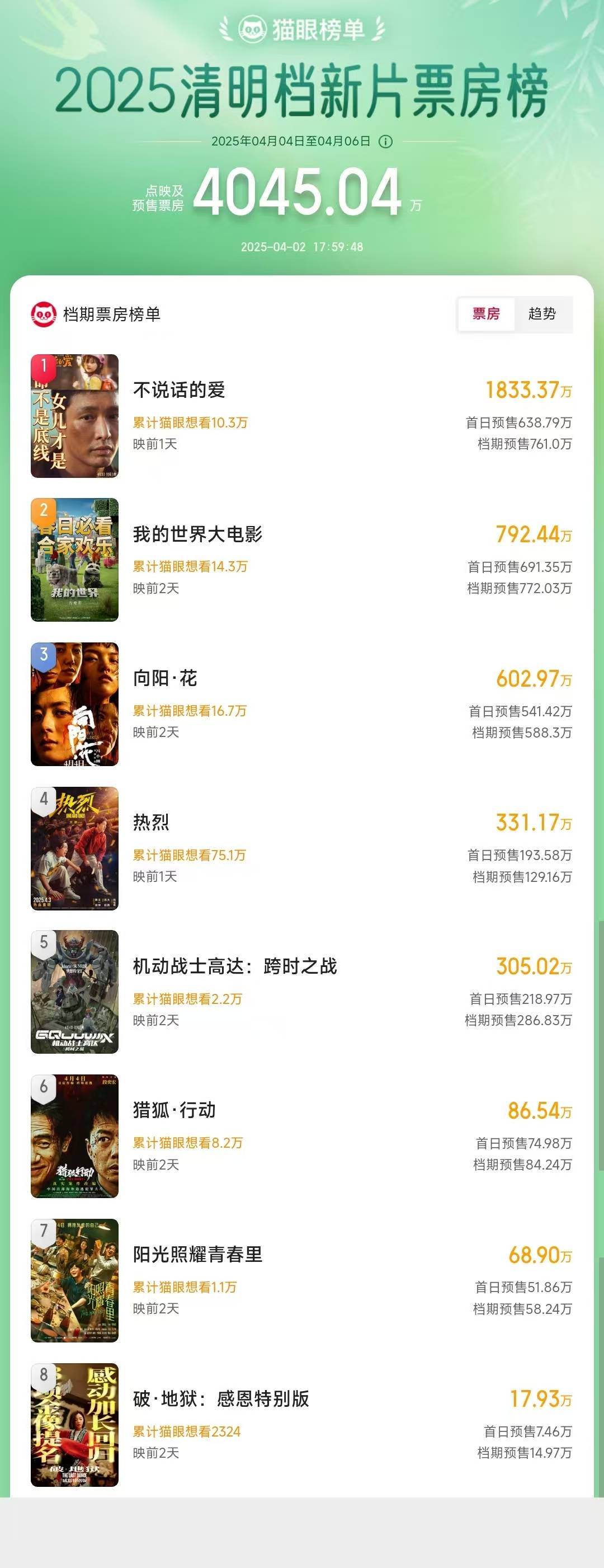 总体而言,清明档电影的预售热度平庸,也在某种程度上反映了这批影片整体市场吸引力的寡淡,难出能够掀起观影热潮的黑马。