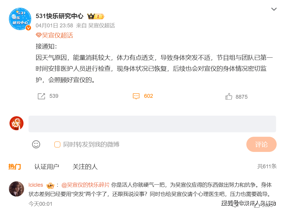 很快吴宣仪方就发声明:因天气原因,能量消耗较大,体力有点透支,导致身体突发不适,节目组与团队已第一时间安排医护人员进行检查,现身体状况已恢复,后续也会对宣仪的身体情况密切监护,会照顾好宣仪的。
