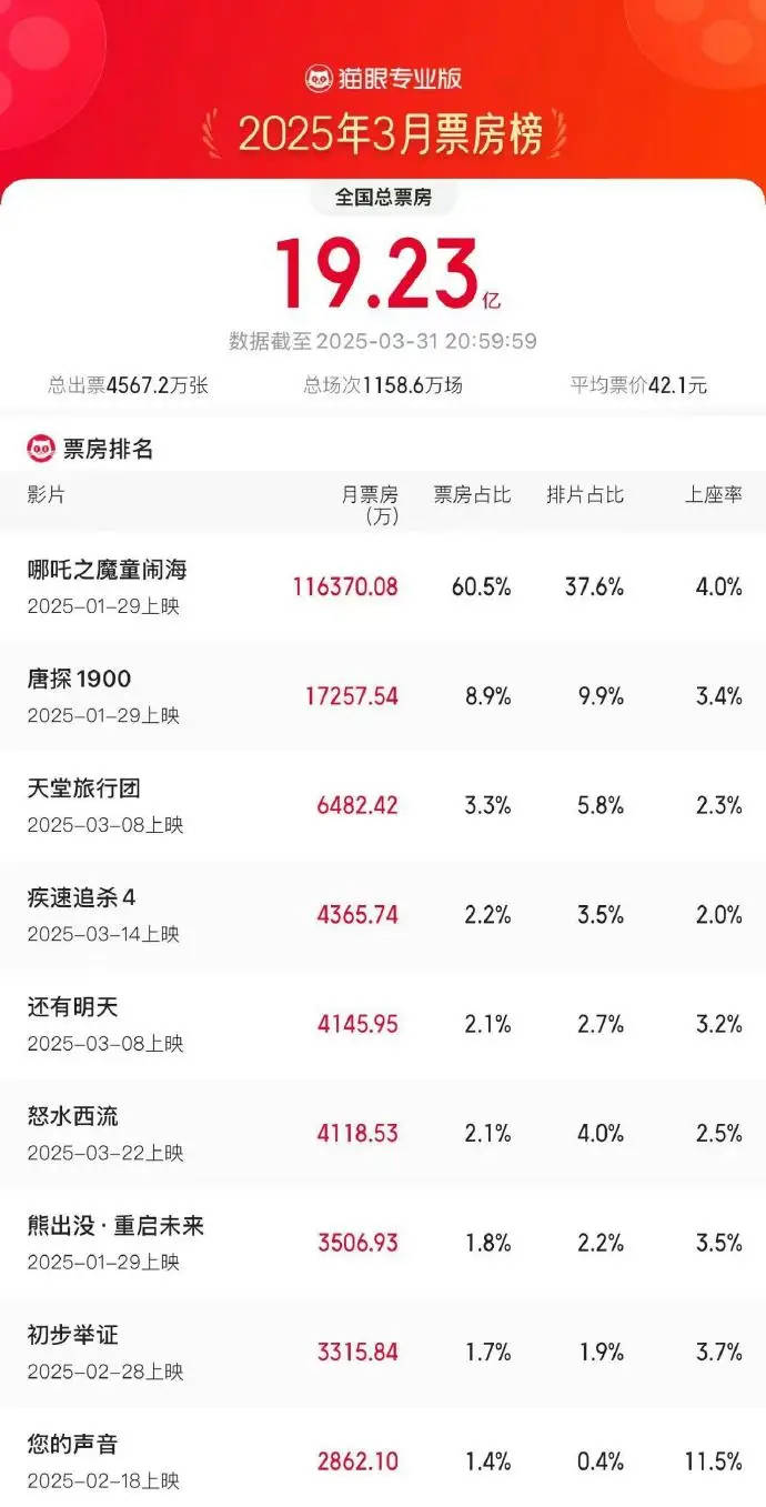 搜狐娱乐讯 3月31日,据猫眼专业版数据,,2025年3月总票房定格19.23亿,《哪吒之魔童闹海》以超11亿票房的成绩,成为3月票房冠军,这也是影片连续第3个月登顶月票房榜,《唐探1900》《天堂旅行团》分列3月票房榜二三位。