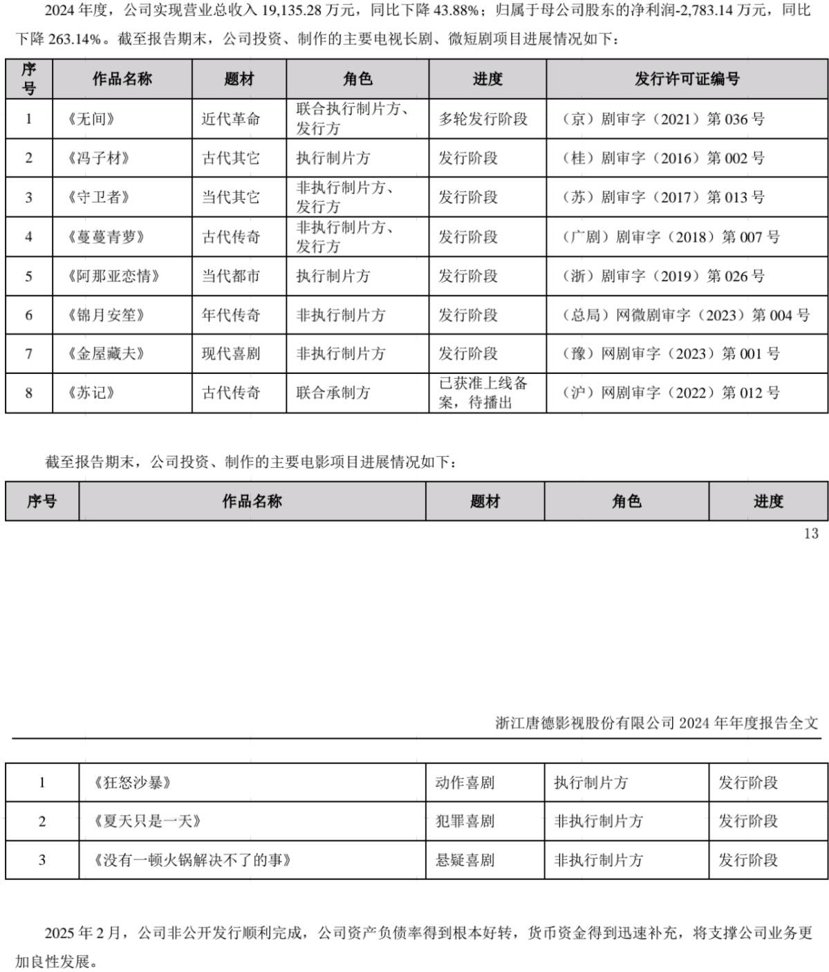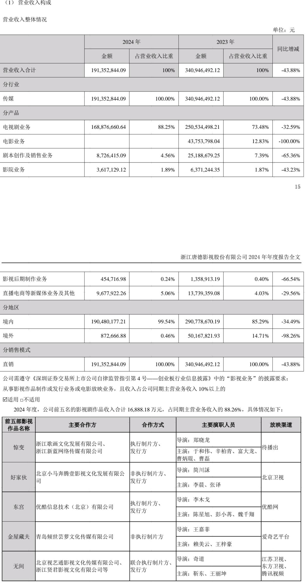 同日,唐德影视发布了2024年年度报告,2024年营业收入1.91亿元,同比减少44%;归属于上市公司股东的净利润为亏损2783万元,上年同期盈利1706万元。